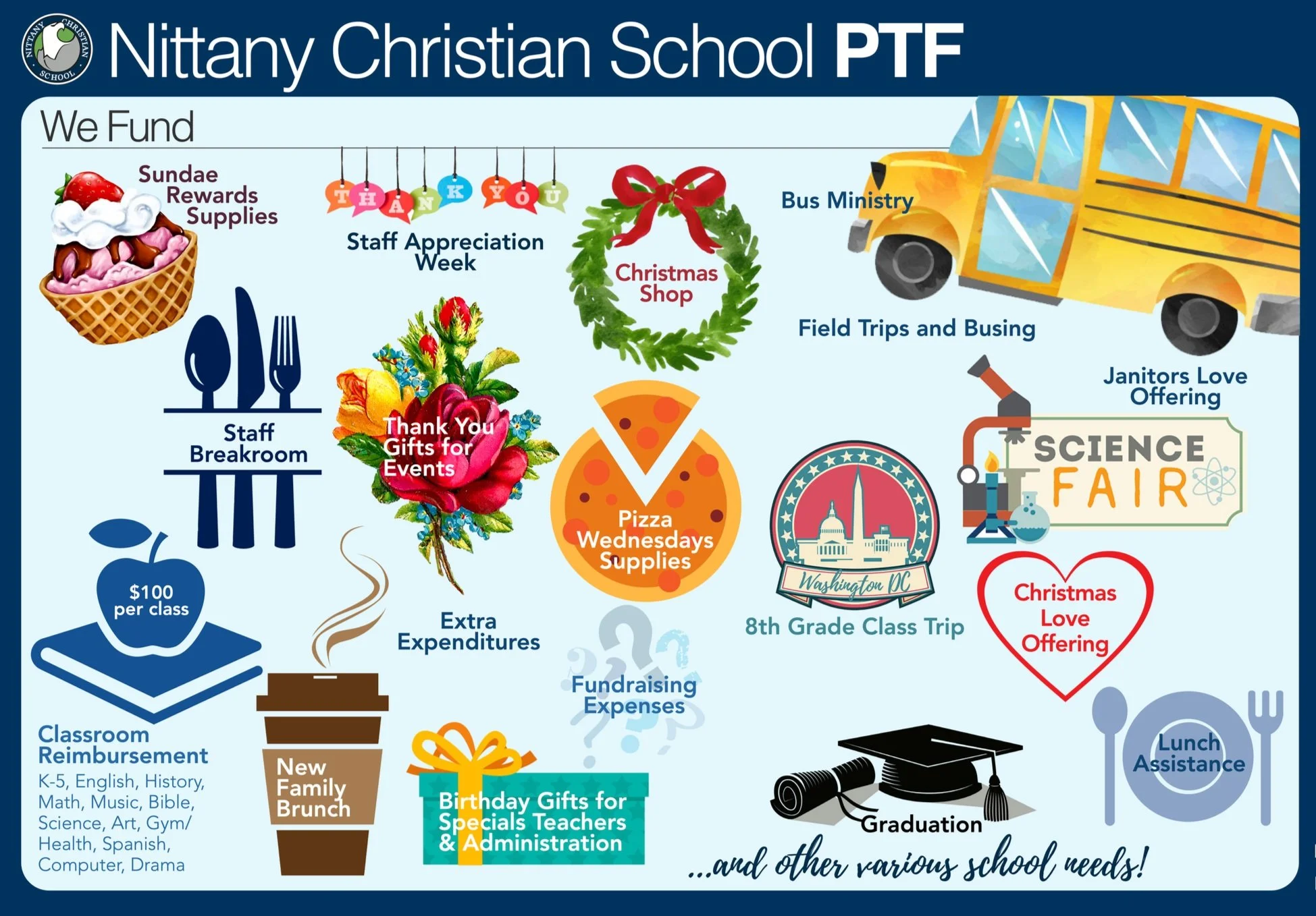 The Parent-Teacher Fellowship (PTF) at Nittany Christian School is committed to helping support the teachers, staff, and students. You can see what we fund for NCS each school year.